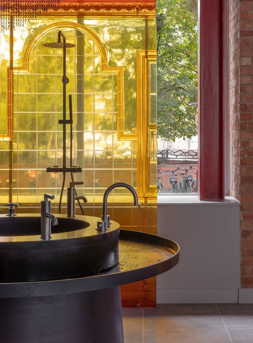 The ground floor is designed to appear like a landscape of industrial chimneys, with ghostly casts of Victorian bathroom wall panels in piercing orange and amber resin, which glow like furnaces. Shower displays are mounted onto ‘chimneys’ and situated beneath chainmail curtains.